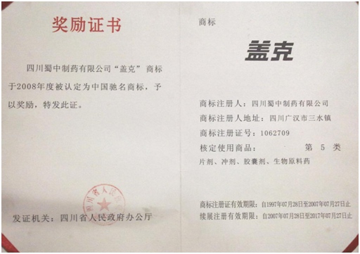公司高度重视品牌战略,依法注册了“盖克”、“蜀中”、“三星堆”、“阿莫锋”、“益善源”、“蓉通”、“pg电子在线模拟器”等108件注册商标,1999年“盖克”、2003年“蜀中”、2007年“三星堆”被认定为德阳市知名商标,2001年“盖克”、2004年“蜀中”被认定为四川省著名商标, 2008年“盖克”商标被国家工商行政管理总局认定为“中国驰名商标”。2017年3月,公司盖克牌、pg电子在线模拟器牌阿莫西林胶囊和多酶片被四川省人民政府授予四川名牌产品称号。2016年,公司实现营业收入66373万元,利税7600万元;2017年,公司实现营业收入75045万元,利税7572万元。公司2017年被命名为德阳市第七批院士专家工作站,2016-2018连续三年被德阳市人民政府确定为重点龙头企业。